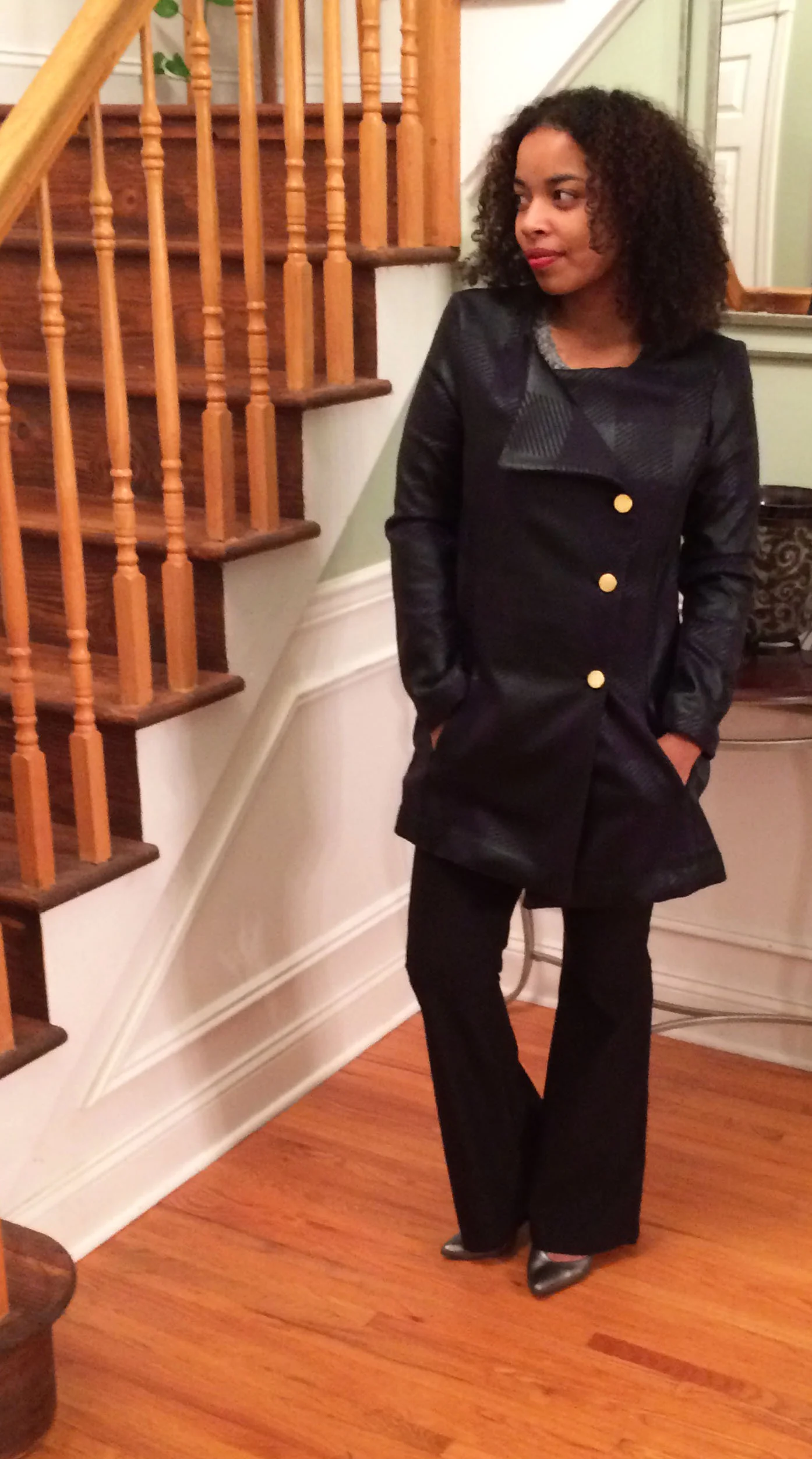 After hours of intricate pattern cutting, precise stitching, and tedious hand sewing, my fall/winter coat is finally complete! I tailored this checkered print medium weight wool blend fabric (from Mood Fabrics) into a sleek coat with a modern and edgy feel. I originally used a pattern for a floor length ("duster") trench coat from Burdastyle, but I made a few changes including: shortening it to mid thigh length, removing the collar, tapering the lapels, and adding a black silk blend lining. Adorned with gold buttons that have a similar checked print, this coat is sure to make a subtle, yet cool statement. One aspect I love about this fabric is the "leather look" it gives from a distance. I look forward to sporting this piece as the temperature continues to drop.