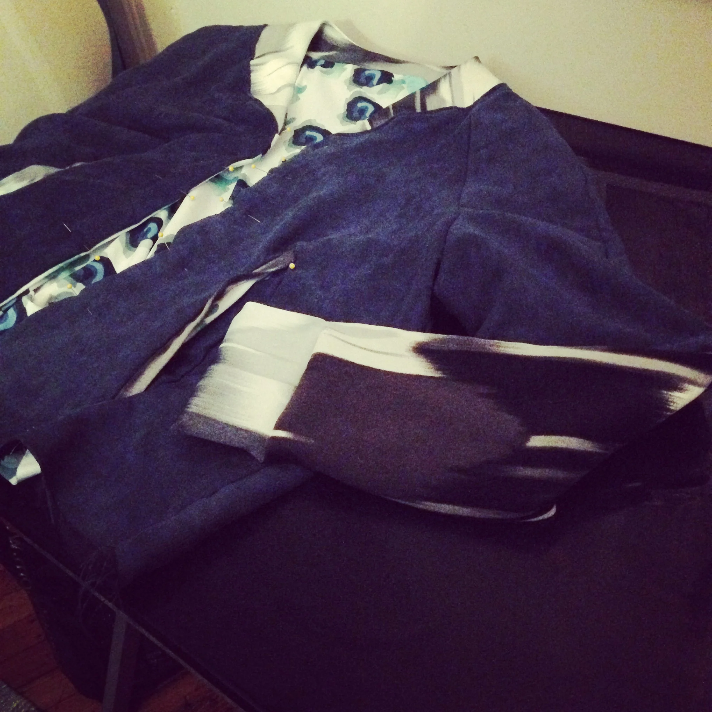 Using the remaining fabric from my previous designs, this multi-textured bomber jacket features a navy blue suede body and a folded half sleeve, double faced brushed twill for the remaining half of the sleeve, collar, and the reverse side of that same twill for the sleeve cuff. Also, for the lining I used the print I designed using an illustration of my late dog, Buster's eyes. I added snaps too and pocket trim using the brushed twill.