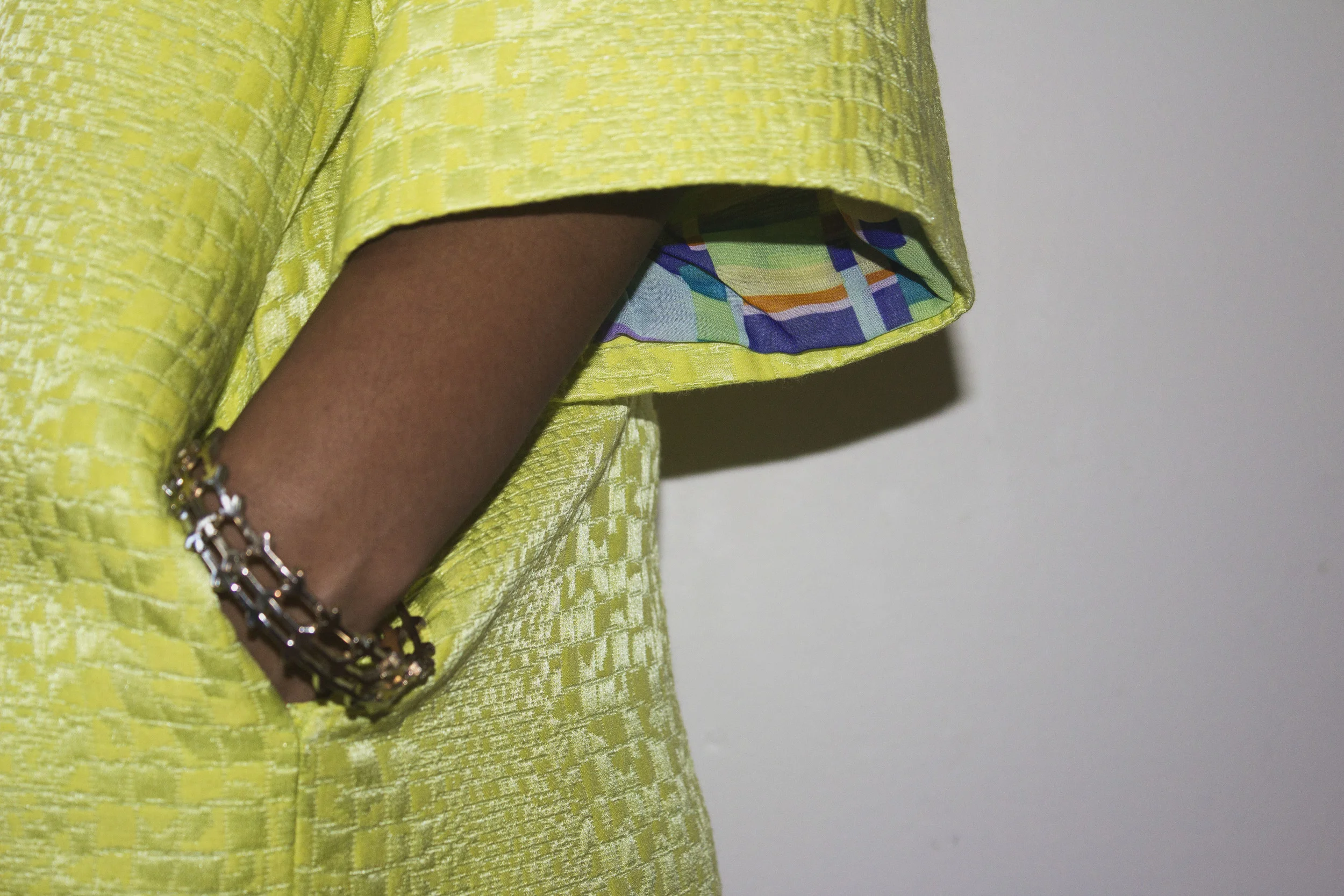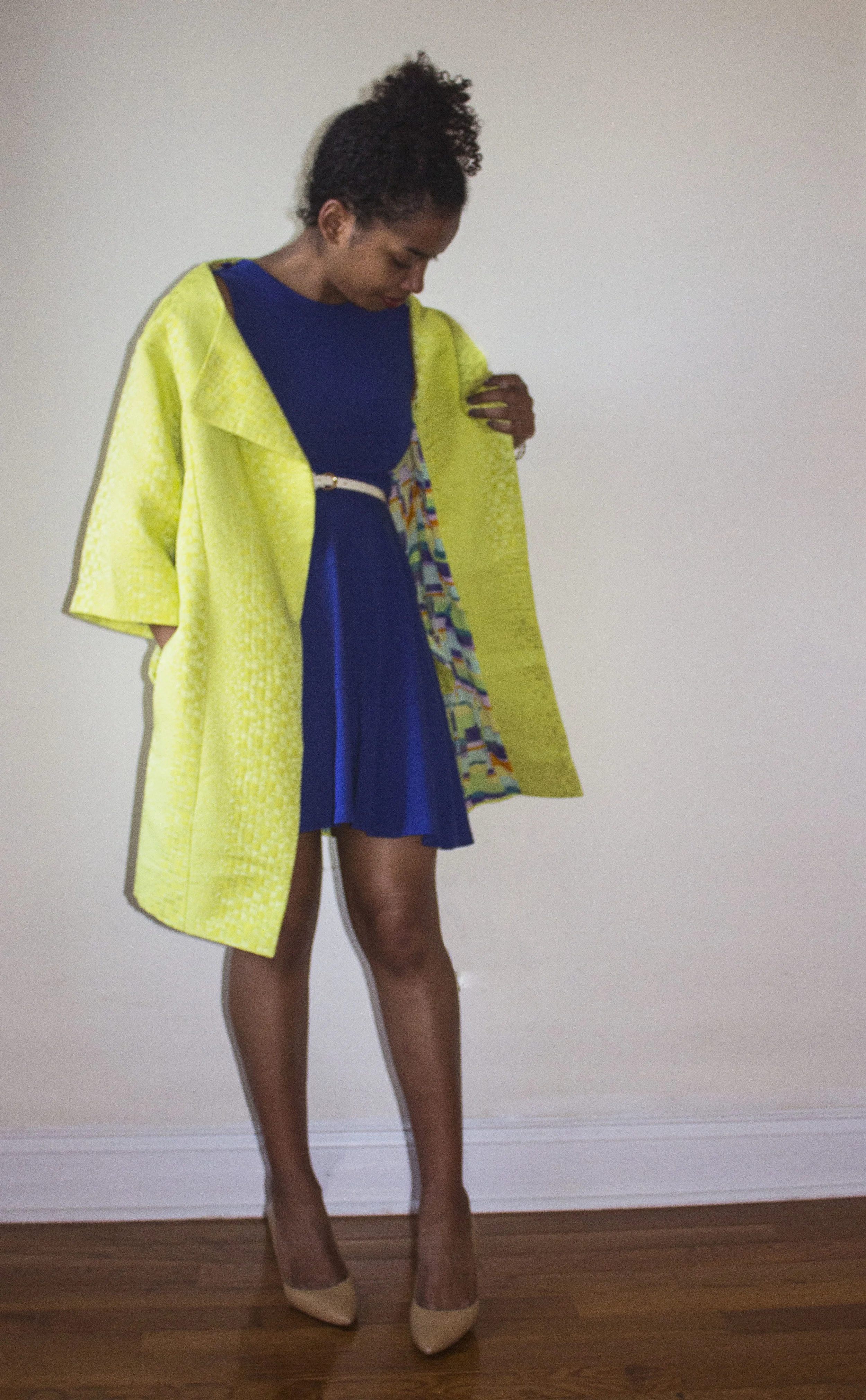 This eye catching outerwear piece was created based off a pattern from BurdaStyle, a site that sells a wide range of great pattens (that can be downloaded and printed at home). Titled "Classic Notched Collar Coat", I made a few alterations to this intricate pattern including the addition of dart seams along the front and back panels and removal of the collar, which makes for a laid back and less formal look. I chose a lime green/yellow textured silk jacquard fabric (from none other than Mood Fabrics) which caught my eye with it's subtly detailed tonal print, that can be truly appreciated upon close examination. To keep things interesting (and bright), I added a bold and playful fabric of a similar geometric print pattern to line the inside of this oversized coat.